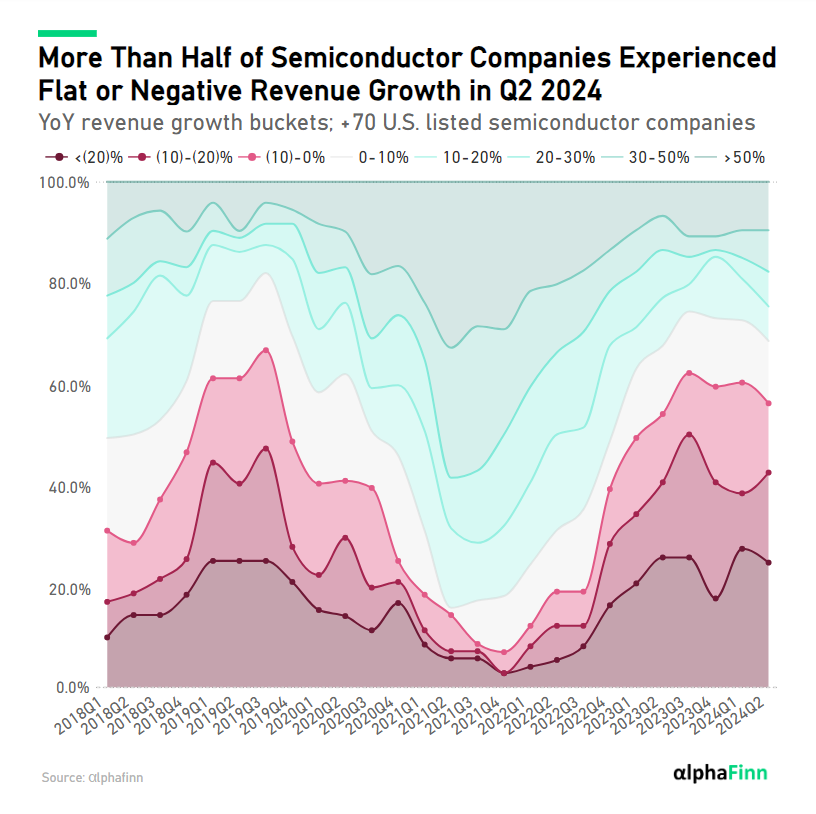 In Q2 2024, more than half (56%) of the +70 publicly traded U.S. semiconductor companies included in this analysis reported flat or negative year-over-year revenue growth.