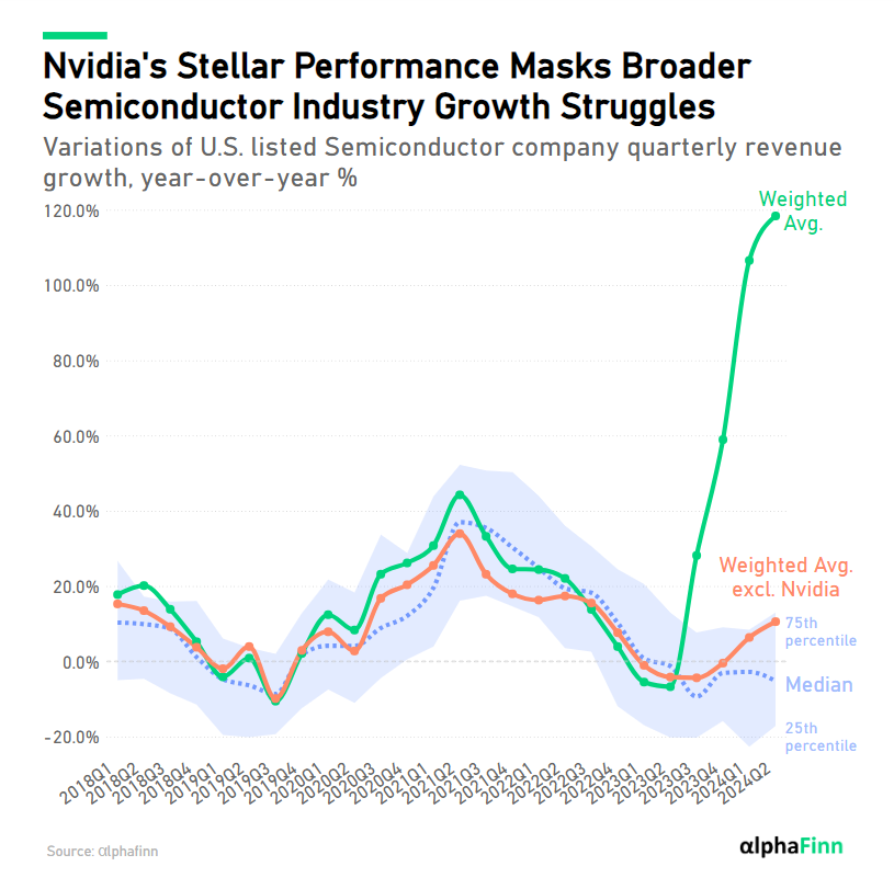 In terms of revenue growth, Nvidia has blown out the water its industry peers with triple-digit year-over-year growth. However, the chip giantโs stellar performance seems to be masking the growth woes of the wider industry, as the median semiconductor company growth was negative for the last 5 quarters.