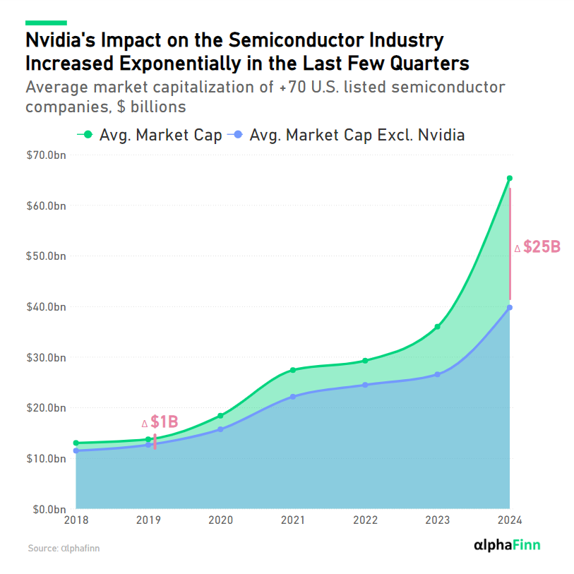 At the end of Q2 2024, the average market capitalization of more than 70 U.S. listed semiconductor companies was $65.3 billion. Excluding Nvidia, this figure drops to $40 billion. Just 5 years ago, in 2019, the difference between the average market capitalization of semiconductor companies with and without Nvidia was ~$1 billion, compared to a $25 billion difference last quarter.